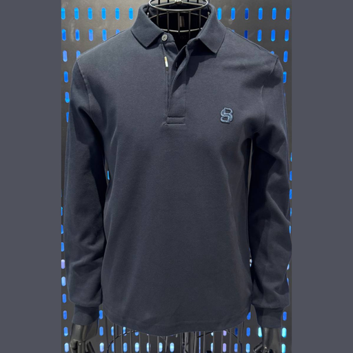 Navy blue and Grey cotton embroidered logo at the chest polo collar front button placket long sleeves straight hem.